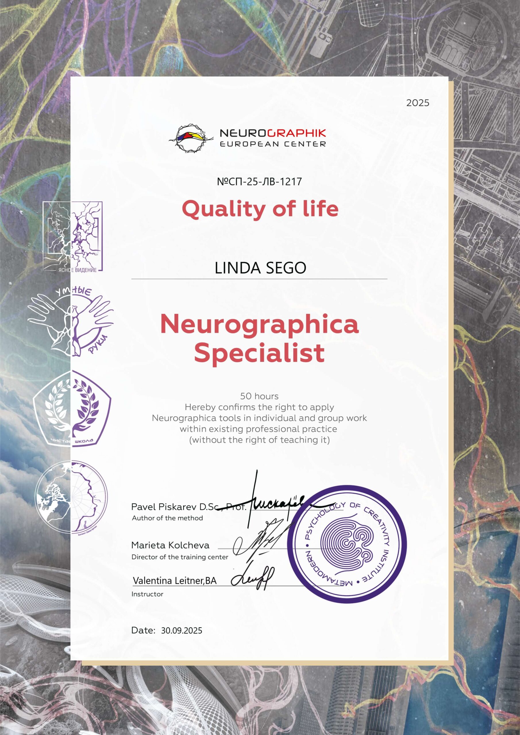 Certifications Neurographica Specialist NeuroColour Certificate Neuro Basic Certificate NeuroSynthesis Ceretificate NeuroColour Certificate First and Second Degree Reiki NeuroMandala Ceretificate NeuroComposition Certificate Psychology Diploma Early Childhood Education Contact Us (385) 208-6177 Text messages only soulhealingwithclarity@gmail.com We accept Visa, Mastercard, American Express, Discover, Diners Club, JCB, and UnionPay — Powered by Stripe