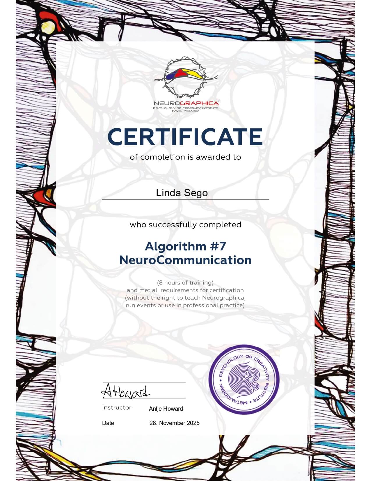 Certifications Neurographica Specialist NeuroColour Certificate Neuro Basic Certificate NeuroSynthesis Ceretificate NeuroColour Certificate NeuroCommunication Certificate NeuroMandala Ceretificate NeuroComposition Certificate Psychology Diploma Early Childhood Education First and Second Degree Reiki Contact Us (385) 208-6177 Text messages only soulhealingwithclarity@gmail.com We accept Visa, Mastercard, American Express, Discover, Diners Club, JCB, and UnionPay — Powered by Stripe